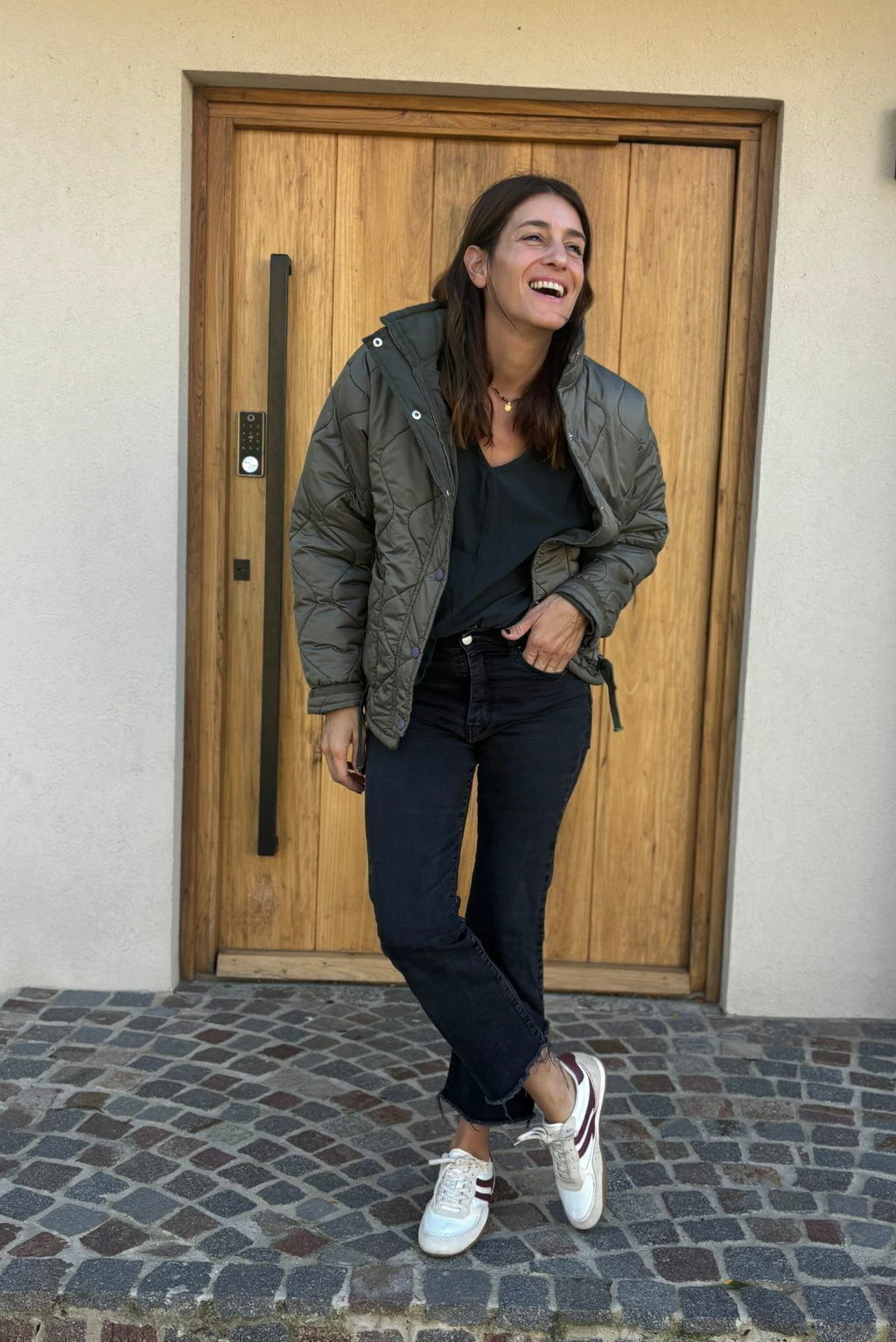 Tiene dos bolsillos grandes con detalles. Posee cuello alto, broches frontales a tono y cordón en la cadera para poder regularla.